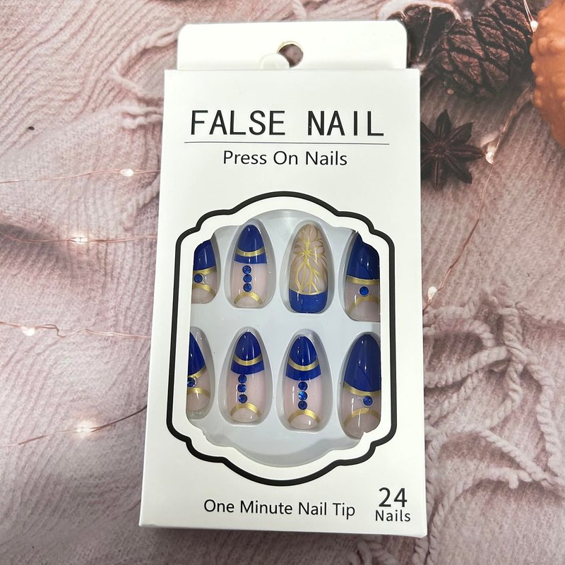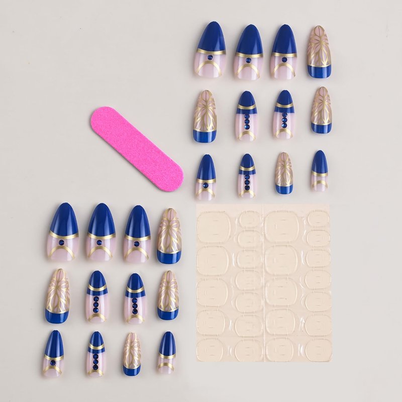 24Pcs Press on Nails Almond Medium with Blue Rhinestones Gold Foil Design French Acrylic Nails for Women Daily Manicure Decorations.