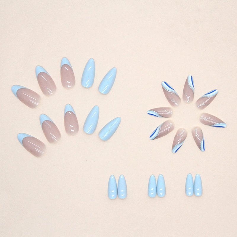 Medium Press on Nails with Design Almond Fake Nails French Stick on Nails Blue Nails for Women Manicure