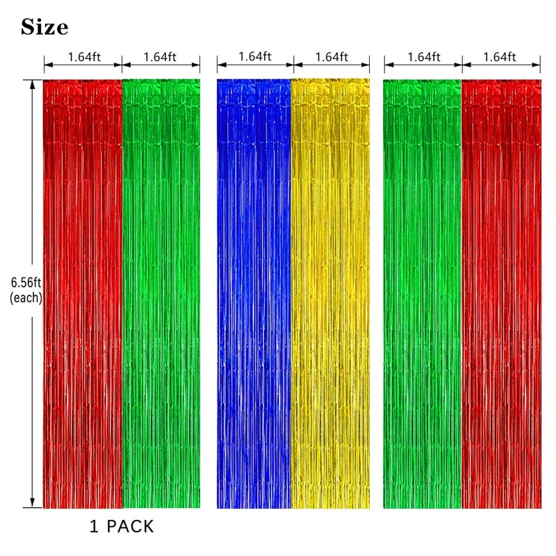 - Blue Red Green Yellow Backdrop Curtain - Blue red green yellow 4 colors, 3 Pack foil curtains, Size: 3.28 x 6.56 feet. May need to order double if you want to cover more space or simply give them a more "tight" look to your decor.