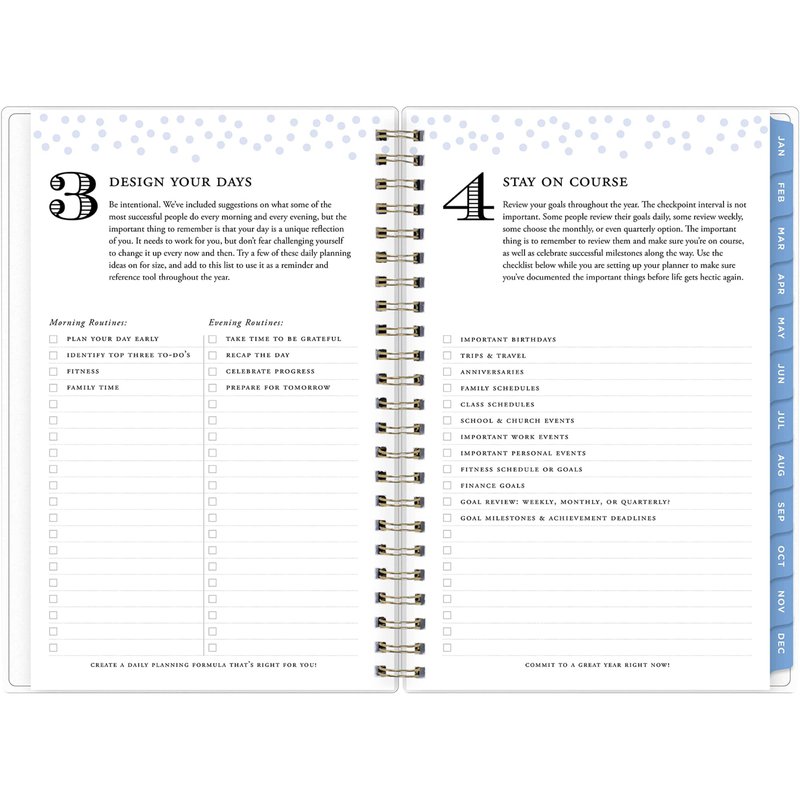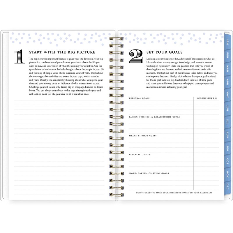 - January 2023 - December 2023 day planner and organizer with weekly/monthly pages and a step-by-step guide for intentional planning; 6 additional monthly pages (July 2022 - December 2022) are included