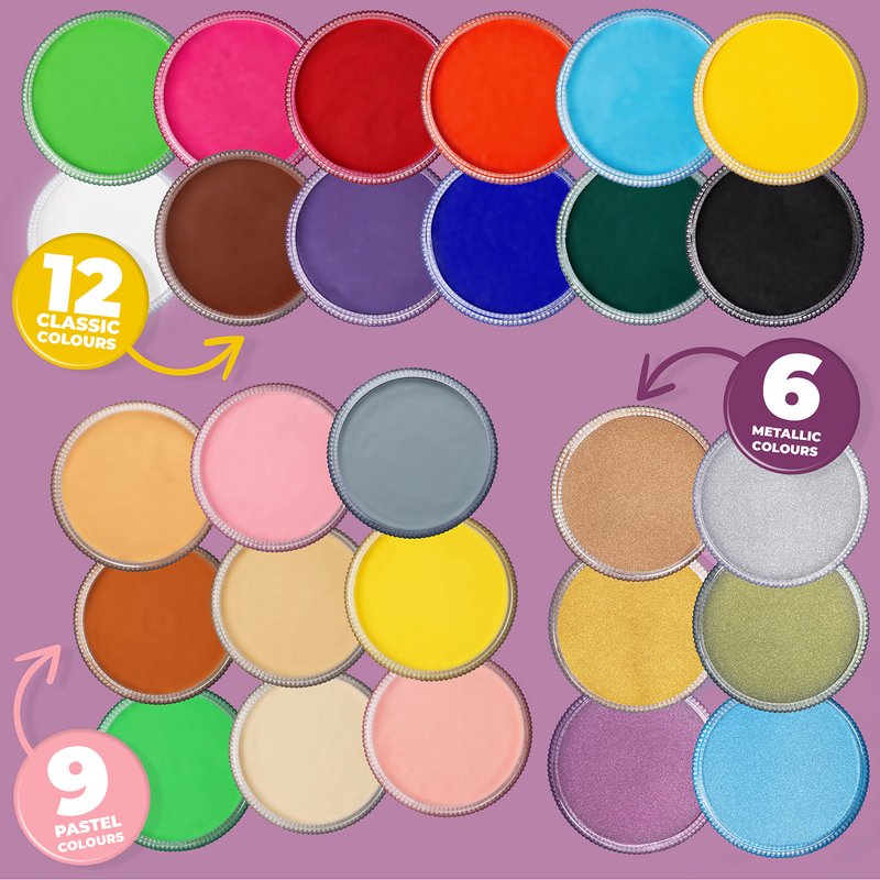 Transform your creative visions into reality with Blue Squid's Professional Face Paint Make up. Whether you're preparing for a cosplay event, a theater performance, or a fun-filled Halloween night, our water-activated face paint offers the perfect blend of skin-friendly ingredients, cream like formula and vibrant colors. The includes a variety of shades, including the highly sought-after white face paint, as well as pink, blue, black, yellow face paint, and many more - ideal for creating standout looks such as clown makeup, corpse paint, or even intricate cosplay designs. Our face paint is water-based, making it easy to apply and remove, ensuring a hassle-free experience for both beginners and professionals. The hypoallergenic face paint & body paint palette is designed to be non-toxic and fragrance-free, making it safe for all skin types, including sensitive skin. With Blue Squid's face paint, you can achieve natural professional-grade results without worrying about skin irritation or allergic reactions. One of the standout features of our face paint is its versatility. From face paints and bodypaint for skin to detailed face painting, our body paint accessories cater to a wide range of artistic needs. The water-activated formula ensures that the paint remains vibrant and smudge-proof throughout the day, making it perfect for long events. Blue Squid's Professional Face Paint Palette is a must-have for anyone serious about their craft. Whether you're a seasoned artist or a novice exploring the world of face and body painting, our washable face paint provides the tools you need to bring your ideas to life. With its easy application, skin-safe ingredients, and professional finish, it's no wonder why Blue Squid is a trusted name in the world of face paint.