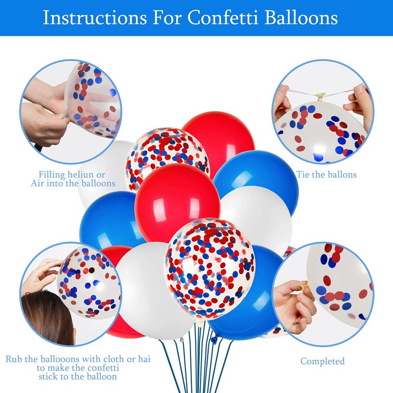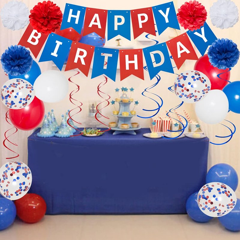 - Red Blue birthday decoration includes: Red Blue "HAPPY BIRTHDAY" Banner, Silver Red and Blue Star String, 6Pcs Paper Pompoms(Red+Blue+White), 6Pcs Red Hanging Swirl, 6Pcs Silver Confetti Balloons, 24Pcs Latex Balloons(Red 10Pcs+Blue 10Pcs+White 4Pcs).
