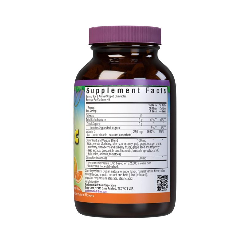 - These orange flavored, animal-shaped chewable tablets are formulated for kids and contains 250 mg of Vitamin C in a base of super fruits and veggies that is sweetened with earth sweet