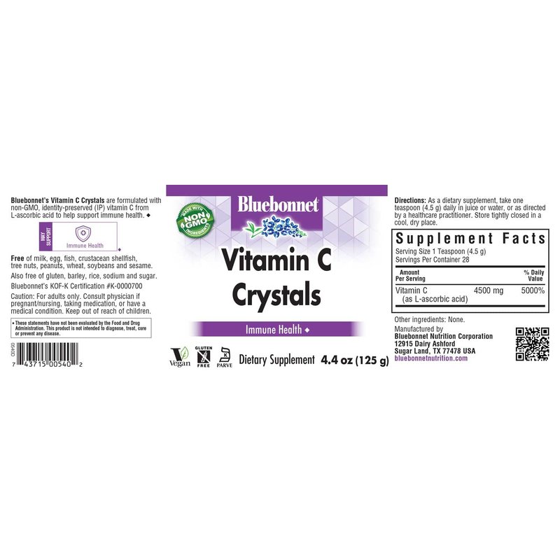 Bluebonnet Nutrition Vitamin C Crystals, for Immune Health, for Antioxidant Protection, Soy Free, Gluten Free, Non-GMO, Kosher, Dairy Free, Vegan, Powder, 4.4 oz (125 g)