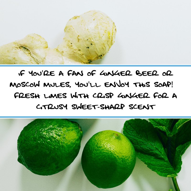 - Fresh Ginger Lime Soap Intense ginger essential oil, balanced with sweet-sharp lime make for this great combo. Hibiscus flowers added for an attractive touch and Organic Aloe concentrate for extra skin softening effect. Ingredients: Vegetable Oil Blend (Organic Sustainable Palm Oil, Organic Coconut Oil, Organic Sunflower Oil, Organic Extra Virgin Olive Oil), Water, Sodium Hydroxide, Essential Oil Blend (Lime Essential Oil, Ginger Root Essential Oil),Hibiscus Powder, Aloe Vera.