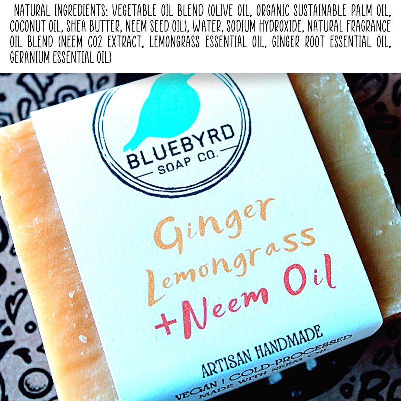 Bluebyrd Soap Co. Ginger Lemongrass All Natural Soap Bar with Neem Oil | Cleansing Beauty Bar Soap Scented with 100% Essential Oils | Neem for eczema prone skin, psoriasis and acne, 5oz. (GINGER)