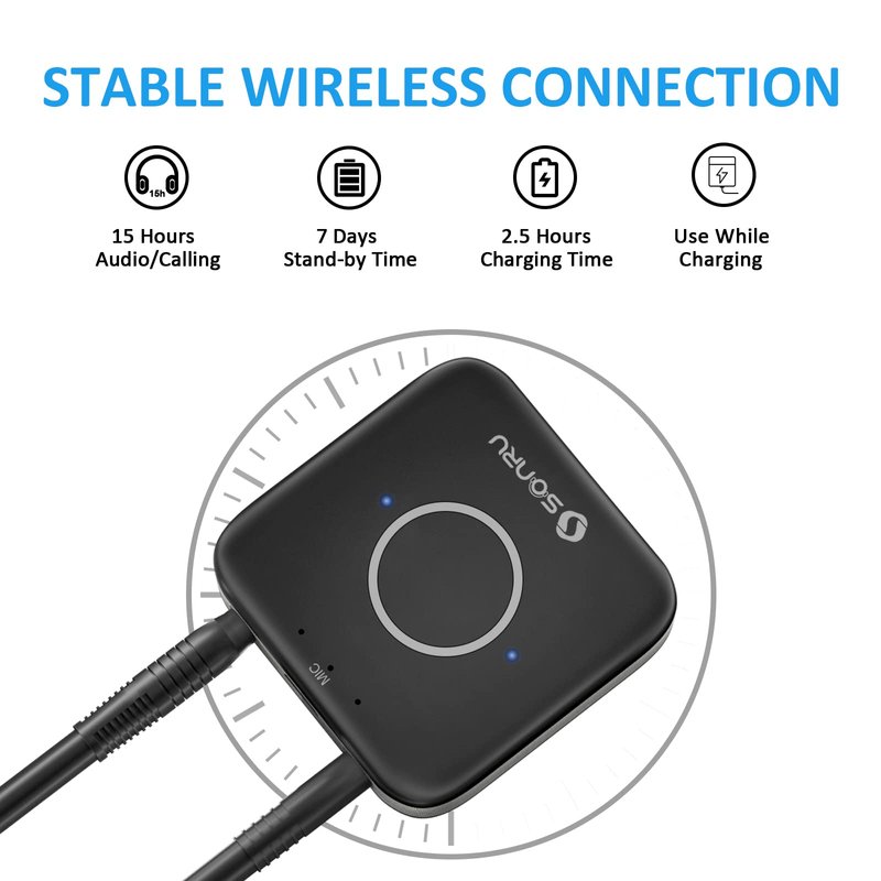 - 【LISTEN MUSIC WIRELESS】SONRU Bluetooth receiver is used to update non-Bluetooth speakers, headphones, home stereo system, car radio speaker, etc. with Bluetooth function. So that you can pair these old audio devices with your phone or Pad and start listening to your favorite music!