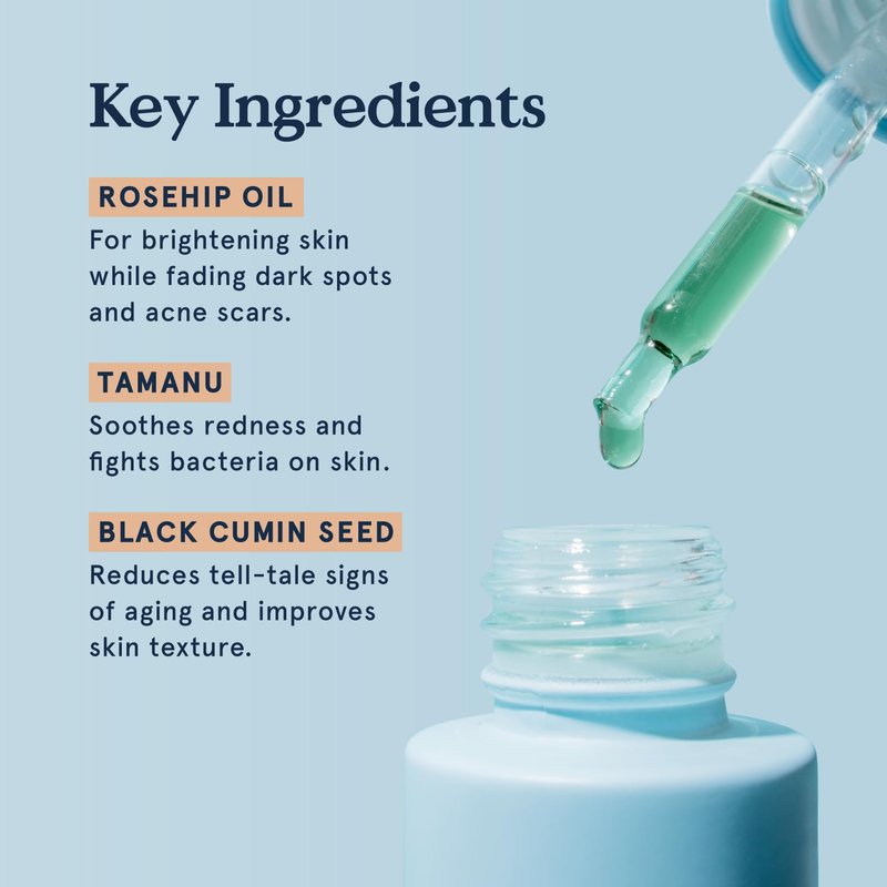 - Clean Ingredients - Soothing rosehip oil helps to retain moisture in your complexion while blue tansy helps to naturally calm and soothe irritated skin. Other key ingredients include tamanu oil and black cumin seed to defend against bacteria and support texture.
