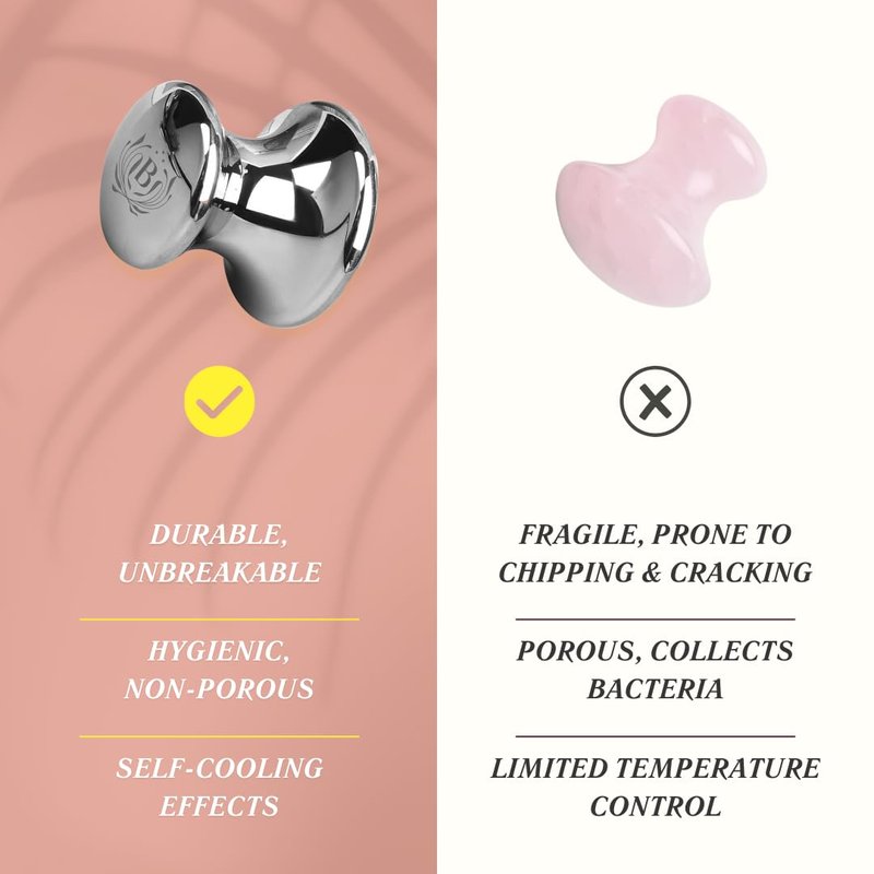 - Durable, Medical-Grade Stainless Steel - Experience durability and safety with our Gua Sha tool crafted from high-quality, medical-grade stainless steel. Unlike fragile materials such as jade, quartz or other massage roller stick brands, our gua sha won't crack or break if dropped, a long-lasting investment in your skincare and wellness regimen.