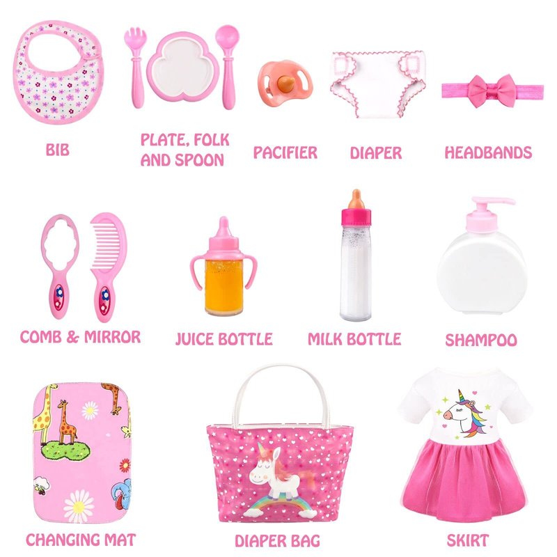 - 【15 Pack Baby Doll Accessories】Include doll diaper bag, changing mat, doll diapers, doll feeding kit, comb, mirror, doll headband, 1 set of baby doll clothes, 2 baby doll bottles and other cute accessories. (NOTE: Doll not included.)