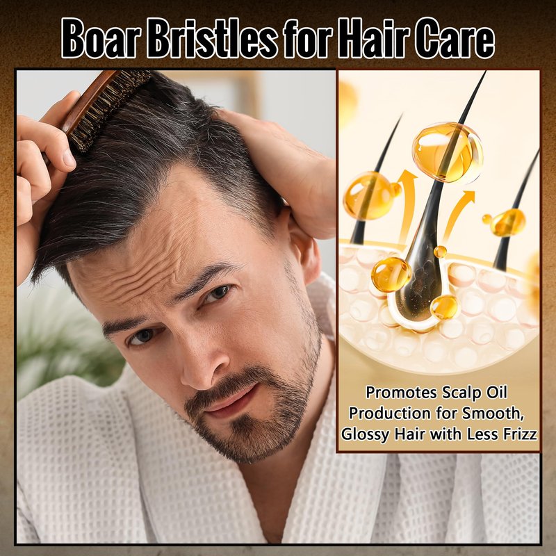 - Scalp-friendly, Boosting Shine - This mens boar bristle hair brush is made of high-quality boar bristles, which are gentle on sensitive scalps, helping seal split ends, prevent hair breakage, and reduce frizz. Efficiently distributing the scalp's natural oils along the hair strand from root to tip for a natural and healthy shine