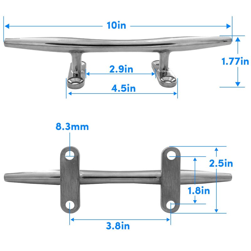 - 【Multi Purpose】 Our 10 in stainless steel boat cleats is high polished surface for mirror-like appearance to match marine uses watercraft/boat/yacht,boat docks, decks, piers for tying up boats, kayaks, jet ski's,etc.