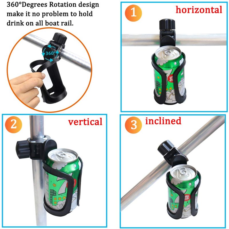 - 【Prefessional Boat Cup Holder】360 rotated design supports it to fit on most boat rail, bimini top rail, pole or handle bar. Whether it is horizontal, vertical, or inclined handrails, these boat cup holder will hold on tight and keep the drink stays in place. Therefore, you can clamp these on wherever you want, and work perfect on pontoon boat, bass boat, Jon boat, Yacht, Dinghy, Kayak, Jetski, Seadoo, Waverunner and so on.