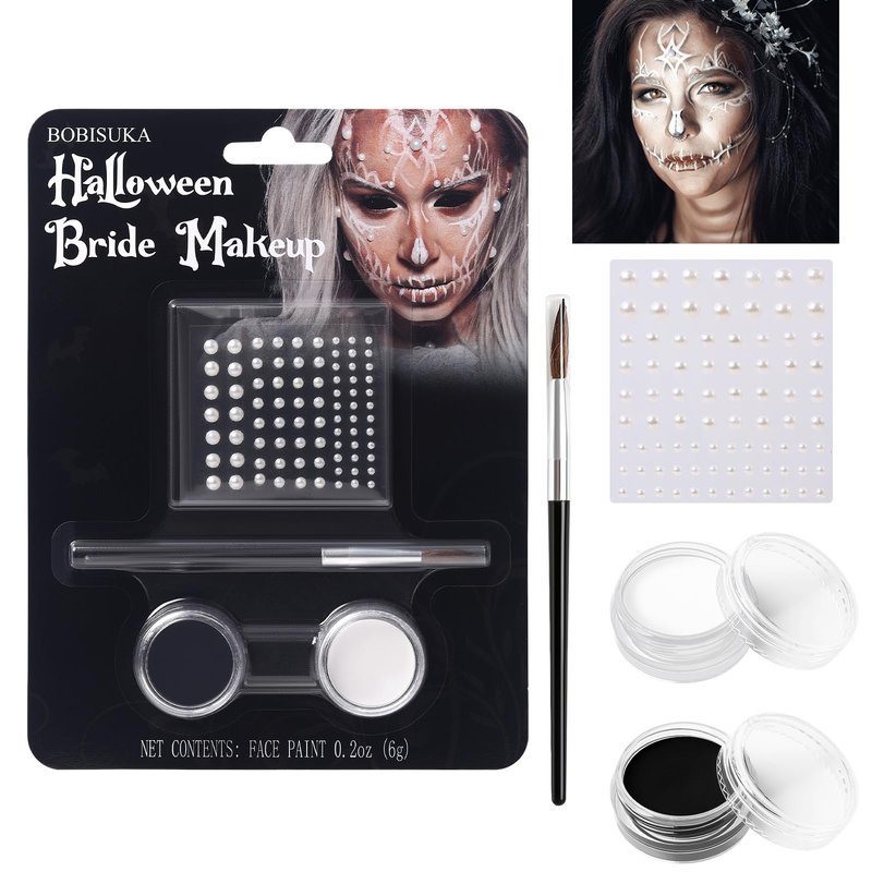 BOBISUKA Black White Face Paint Bride Makeup Kit, Halloween Makeup Kit Includes Black & White Face Paint, Brush, Costume Accessories Crystal Sheet for Halloween Party Costume Skeleton SFX Makeup