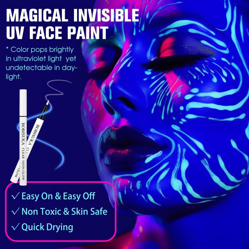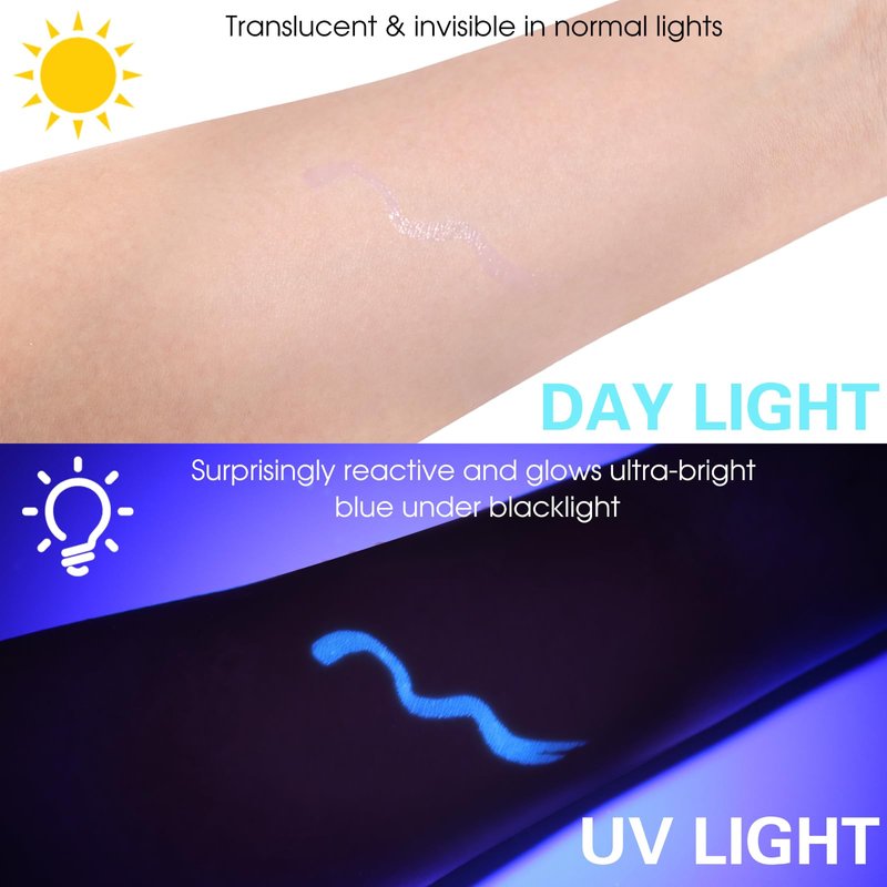 - Glow under UV black light: Long-lasting UV-reactive liquid liner has minimal fall out that won’t fade, flake and bleed. Smear-proof and sweat proof. Color pops brightly in ultraviolet light yet undetectable in daylight.
