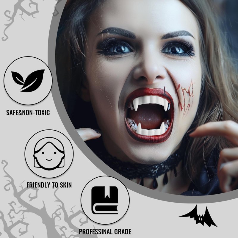 - 【Halloween Vampire Makeup Kit】Includes white face & body paint(3g), realistic fake blood(10ml), black & red face paint crayon(2.5g*2), vampire teeth fangs, this easy to carry fx makeup kit can satisfy your special effects makeup needs, allowing you to easily create realistic and natural wound special effects.