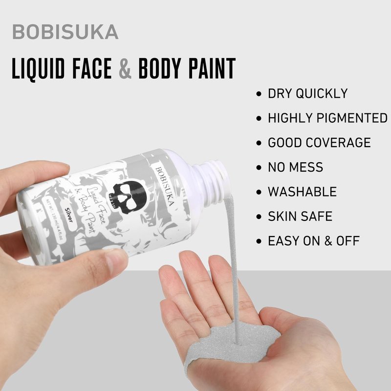 - 【Liquid Texture Face and Body Paint】BOBISUKA liquid texture face & body paint made from cosmetic-grade ingredients. There are 12 vibrant shades, black, white, red, orange, light green, blue, light purple, pink, grey, brown, gold and sliver. Experience a highly pigmented, long lasting formula that ensures full coverage with a velvety finish, lasting all day.