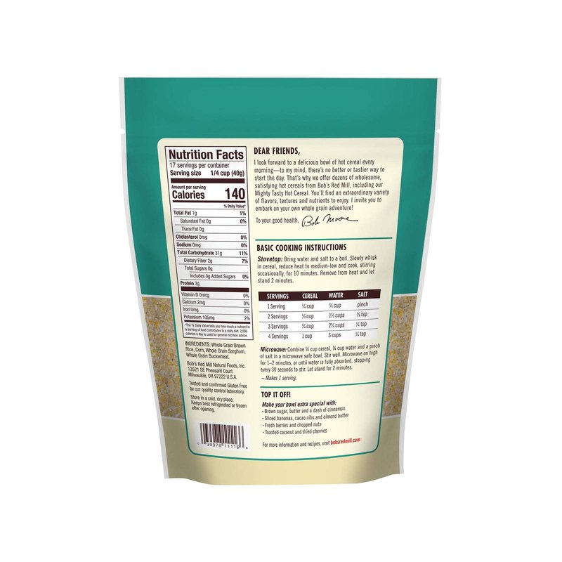 - Bob's Red Mill Gluten Free Mighty tasty hot cereal is a unique blend of brown rice, corn, buckwheat and sorghum which creates a truly "Mighty tasty" (And might healthy!) breakfast. Use your favorite toppings to make the cereal your own - Sweet or savory, this cereal is great topped with cheese and chive or brown sugar and raisins.