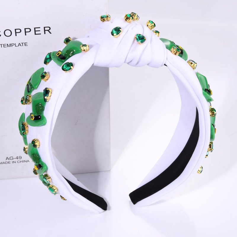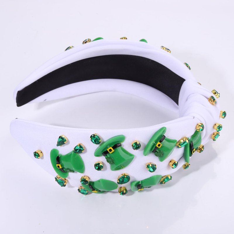 - St.Patrick's Day is a fun-filled holiday,and celebrations practically require revelers to wear green,the day's signature hue.Celebrate St. Patrick’s Day in style in this St.Patrick's day headband that features a beautiful white top knot headband with green top hat charms,embellished with green crystals for a dazzling look.These funny Leprechaun hat headband highlights your St.Patrick's Day costume is ideal and makes a lot as a juicy-green accessory!