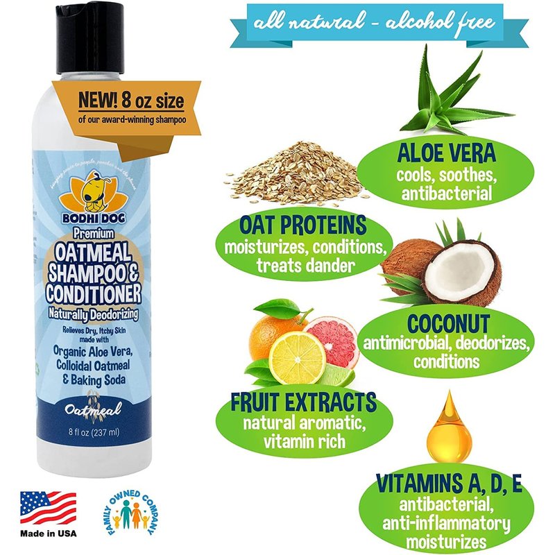 - SOOTHES AND MOISTURIZES DRY, ITCHY SKIN: Our all plant botanical based moisturizing pet shampoo contains high quality natural ingredients including oat proteins, aloe vera, coconut, vitamins A, D & E and fruit extracts to provide instant cooling and calming relief to inflamed, damaged skin. Our gentle oatmeal and baking soda shampoo soothes irritated skin and helps to relieve itching and scratching while leaving your dog or cat fresh and clean with moisturized skin and silky, conditioned fur.