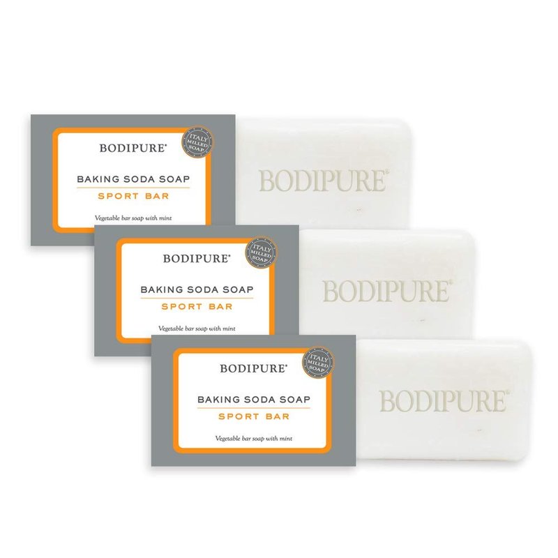 - 3️⃣Pack of 3 (4.4 oz/each) Face and Body Bar Soap: Gentle, mild, 3-in-1 baking soda infused vegetable soap bar that deep cleans, exfoliates, and brightens skin. Nourish and pamper your skin with Bodipure Sport Bar Soap with natural baking soda to deeply cleanse face and body.