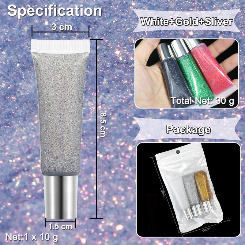 - 3pcs Glitter Set:Super fine glitter hair gel, three color glitter combinations bring different glitter makeup designs, constantly shimmering and glowing in different light