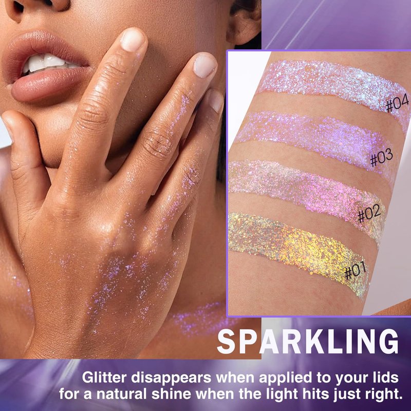- 【Body Glitter Gel】A holographic body glitter gel that provides the subtlest shine for a shiny and radiant look. You can adorn it on your body, face, hair, eyeshadow or anywhere you like, adding sparkle and extra glamor to your style.