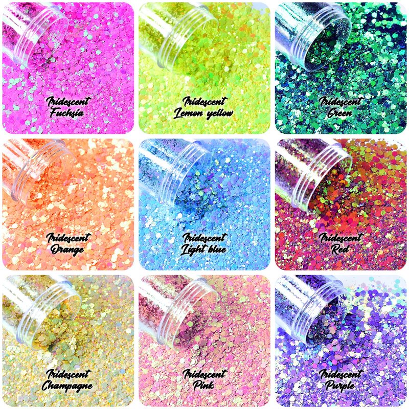 - COLORFUL: Ultra sparkling glitter comes in 9 amazing shades: Iridescent Orange, Iridescent Light Pink, Iridescent Purple, Iridescent Sky Blue, Iridescent Yellow, Iridescent Purple, Iridescent Deep Pink, Iridescent Deep Red, Iridescent Royal Blue, which varies with the change of viewing angle, base color, and light