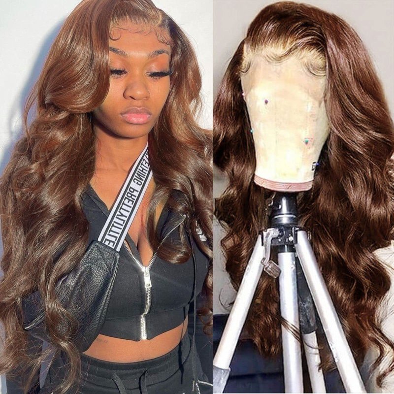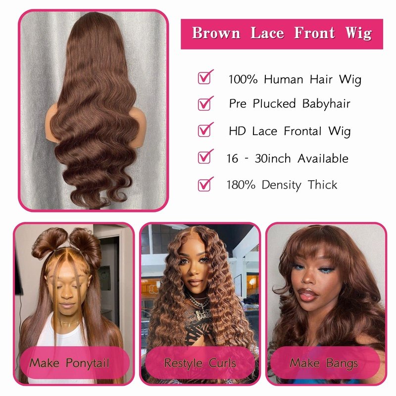 - Chocolate Brown Lace Front Wig Human Hair:Chocolate brown body wave 13x4 Hd lace front wigs suitable for all skin colors, It can blend and look more natural, soft and bouncy, breathable and lace material make it more comfortable