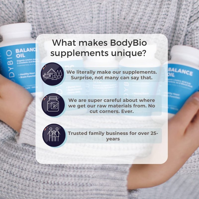 - Brain Health: BodyBio Balance Oil is shown to support the cells, brain, mood, heart and also positively affect the appearance of hair and skin. Our unique blend of DHA and EPA omega 3 & 6 formula truly helps you to look and feel your best*.