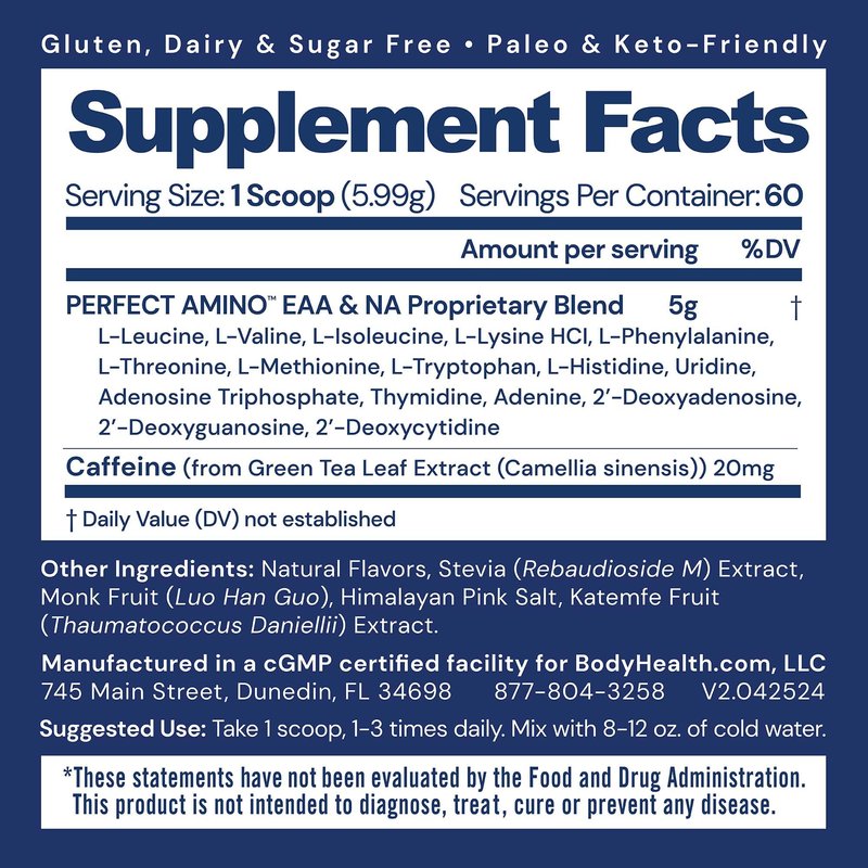 - WILL NOT BREAK A FAST. BCAAs amino acids are free from sugars, yeast, gluten, soy, corn, wheat, rice, and preservatives. Perfect Aminos is vegan sourced, keto, and produced in cGMP Certified facilities in the USA for assured quality and safety.