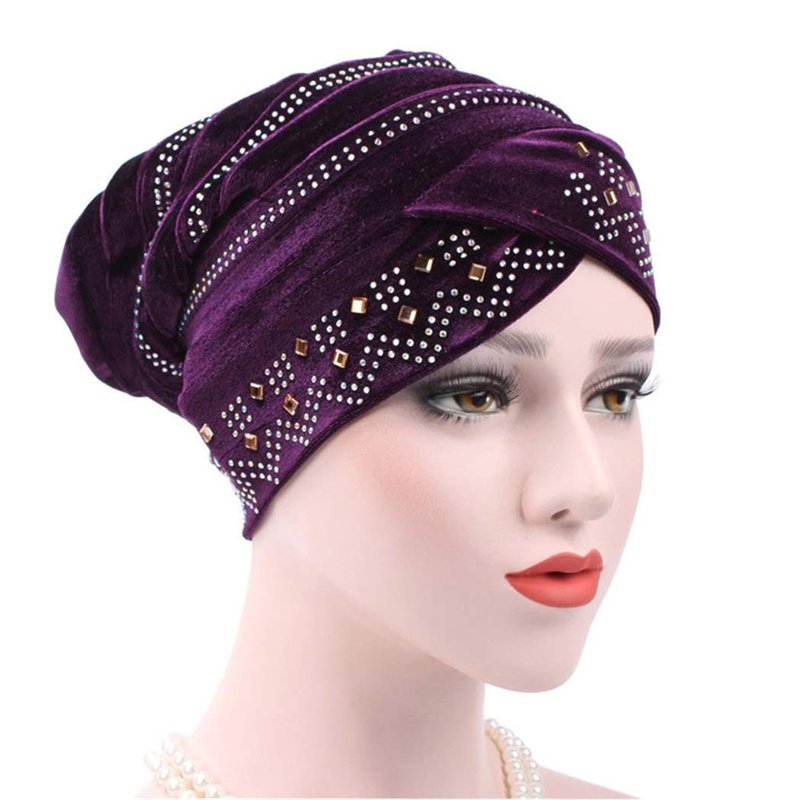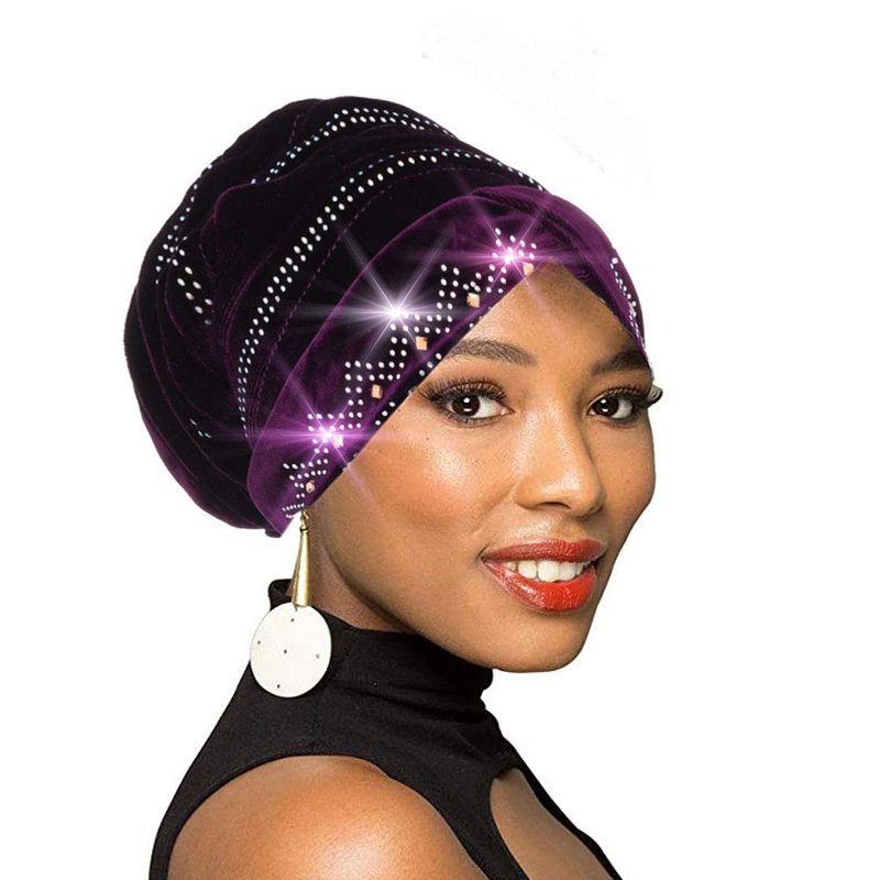Bohend Rhinestone Turban Headband Sleep Headwrap Wide Sparkly Sleep Crystal Muslim Hat Headwear Beanie Velvet Hat Cap Hair Wrap for Women and Girls (Deep Purple)