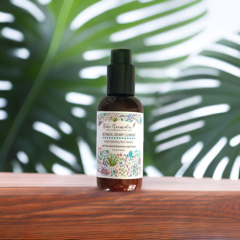 Boho Aromatic's Botanical Creamy Cleanser is Gentle Creamy Face Cleanser. It's Non-Foamy and melts away makeup with a unique creamy balmy aloe texture. Enriched with Botanicals and Cleansing Oils to help cleanse skin gently, yet effectively, while maintaining moisture levels. The Botanical Creamy Face Cleanser is great for all skin types. Our cleanser will clean your skin the natural way and keep the skin barrier intact. This Face Cleanser has a light rosemary scent and made with an easy one-hand pump. Free Konjac Sponge by This Hippie Girl, is included with this cleanser!