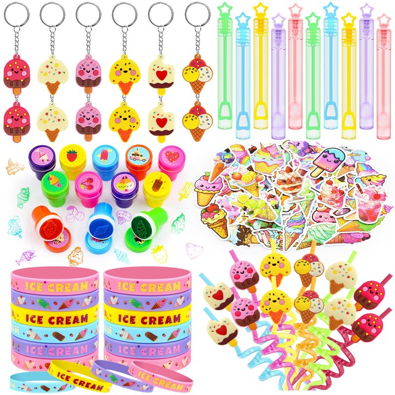 - đ¨ăDelightful Ice Cream Themed SetăMake your party extra sweet with this delightful ice cream themed favor set! It includes 12 ice cream keychains, 12 ice cream silicone bracelets, 12 stamps, 12 bubble wands, 12 reusable straws, and 50 ice cream stickers. Perfect for adding a touch of fun and color to any celebration