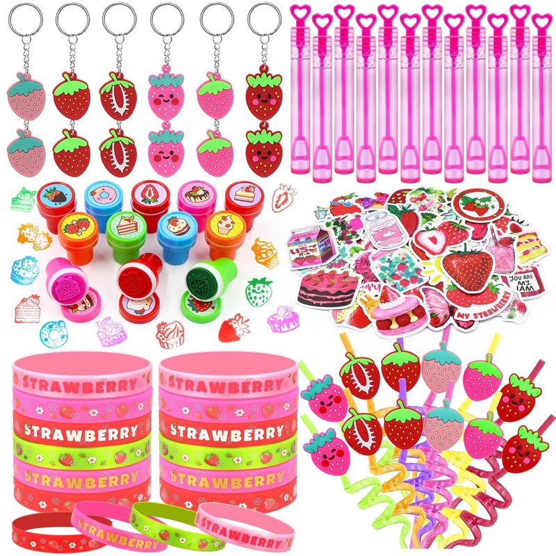 - 【Complete Strawberry-Themed Set】Make your party extra sweet with this adorable strawberry-themed favor set! It includes 12 strawberry keychains, 12 strawberry silicone bracelets, 12 stamps, 12 bubble wands, 12 reusable straws, and 50 strawberry stickers. Perfect for bringing a touch of fruity fun to any celebration