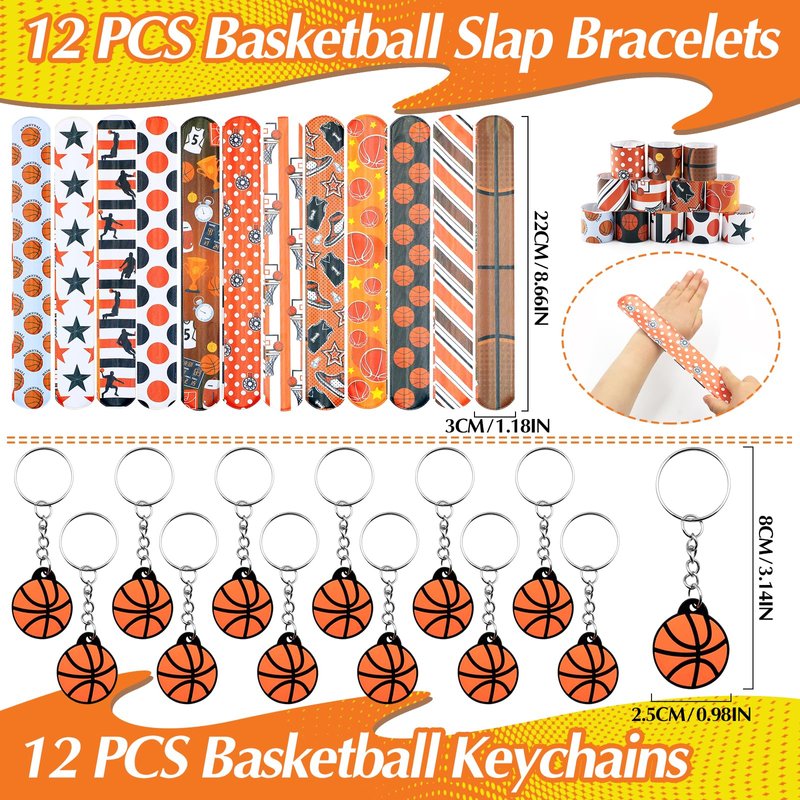 - đăBASKETBALL PARTY FAVORSăIncluding 12 sheets of basketball temporary tattoos, 12 basketball keychains, 12 basketball silicone bracelets, 12 basketball slap bracelets, 12 mini basketball stress balls, 50 basketball stickers, 12 basketball gift bags. Each item is designed to meet your diverse party needs with ample quantities
