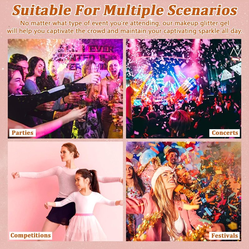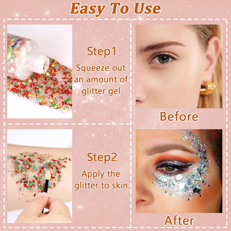 - The Glamour Of Face Glitter Gel: Our glitter gels have iridescent shine and provide a unique sparkling look. From party to wedding, spirit week, festival, art competition, concert, stage show and bar, our glitter sequins will add sparkle to your look. Whether you're looking to sparkle in your everyday life or looking for glitter tones for a themed event, our glitter gel for face will help you exude glamour. Also, The body glitter can also be shared with friends and family.