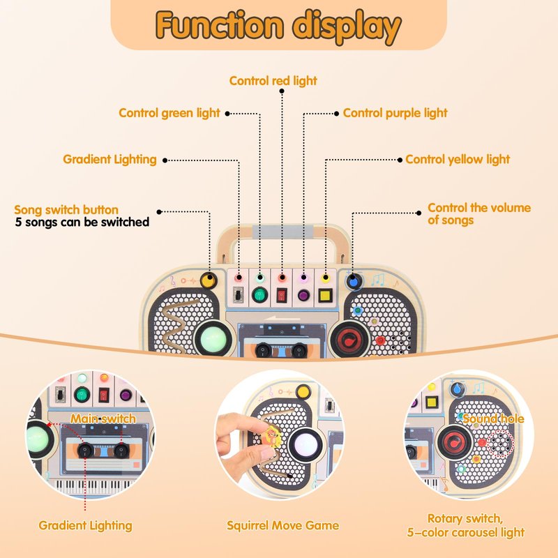 - Innovative Learning Tool: This Montessori Wooden Busy Board LED Voice Recorder for toddlers 1-3 design with 10 style switches and 10 LED light bulbs 5 music toggle switch, and volume level adjustment. The sensory board with diversify switches and lights make toddlers fascinate. It is able to keep kids busy for longer than an hour.Needs 2 AAA Batteries,but battery not included.
