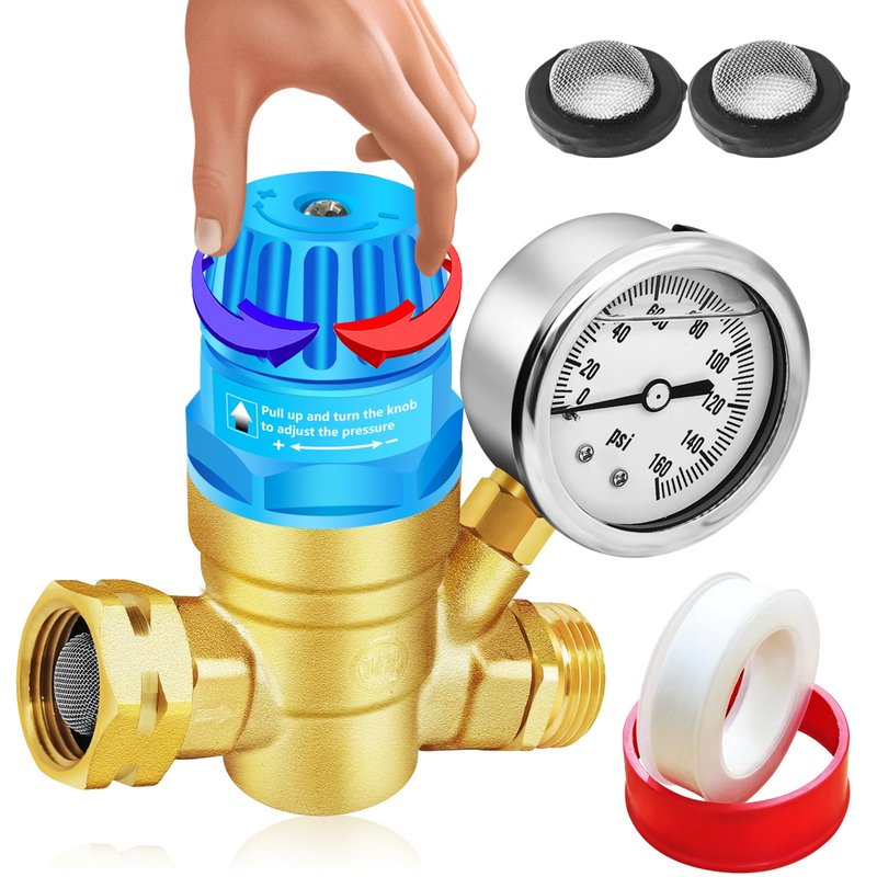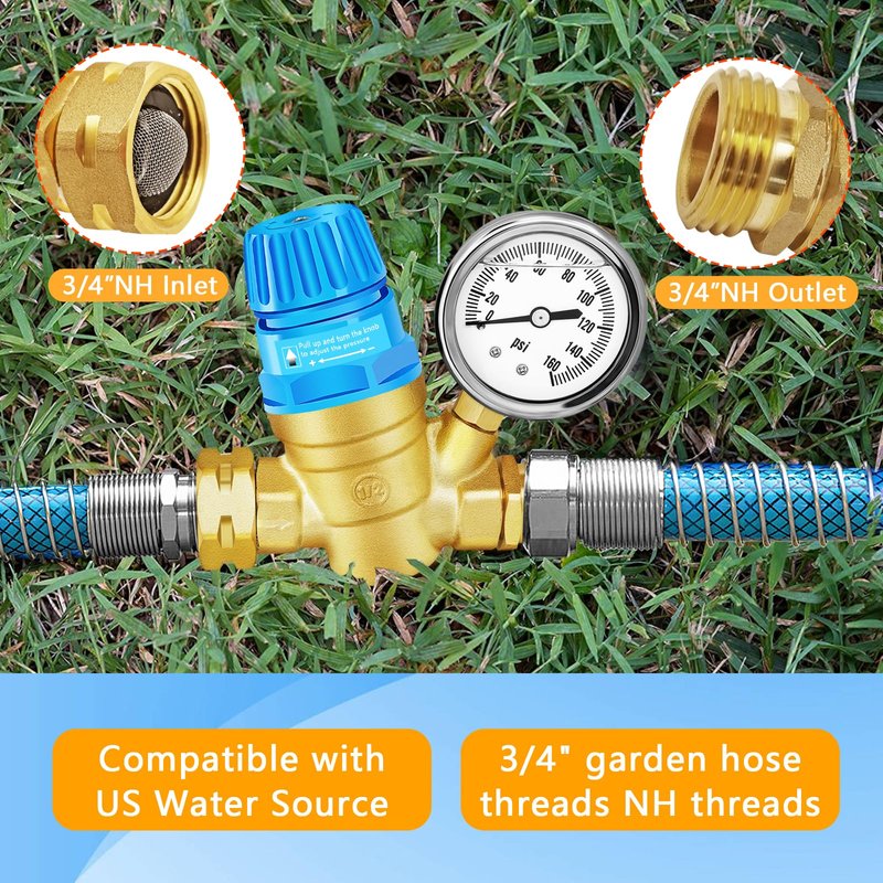 Water Pressure Regulator, 3/4’’ GHT Handle Adjustable Brass Lead-Free RV Pressure Reducing Valve with Oil Filled Gauge 160PSI for RV Camper Travel Trailer Garden Feature: 1. Regulate the water's pressure coming into your camper, protect RV/trailer from high water pressure. 2. Gauge displays up to 160 PSI, factory setting is about 45 PSI. Dial pointer will rotate when turning the knob. 3. Oil inside the gauge minimizes friction between internal components for longer life, regulator inlet screen mesh helps to filter particles to prevent impurity blocking. 4. Temperature changes or shaking of shipping may cause bubbles in the pressure gauge, which is normal. if you have any questions, we are here for you at any time. 5. The packaging includes a water pressure regulator, two inlet screen filters, one sealing tape. Specification: Material: lead-free brass Applicable medium: water Nominal diameter: DN20 Thread: 3/4" NH thread Pressure environment: atmospheric pressure Operating temperature: 14F ~ 200F Direction of flow: Unidirectional Maximum Pressure: 160 psi Installation Guide: 1. Connect the female fitting on the adjustable water regulator directly to your water source's hose bib. 2. Connect the male fitting on the water hose to the male fitting on the adjustable water regulator. 3. Turn on the water supply in order to flush the water regulator and hose for one minute. Turn off the water supply. 4. Connect the hose to your RV's water inlet, then turn on the water supply. 5. Turn on all RV fixtures to allow any air to be flushed out of the RV plumbing - this includes turning on showers, faucets, and flushing toilets. 6. Adjust the regulator at top by hand until it is set to the desired pressure reading. Ensure that all RV fixtures have been turned off while making adjustments until you reach the desired pressure reading.