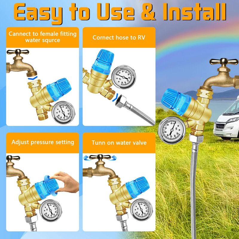 - 【APPLICATION】 The water pressure can be clearly seen on the gauge, it’s easy to precise control of the water pressure, protect your pipe system for long time using. It's great for camper, trailer, RV, garden, plumbing System.