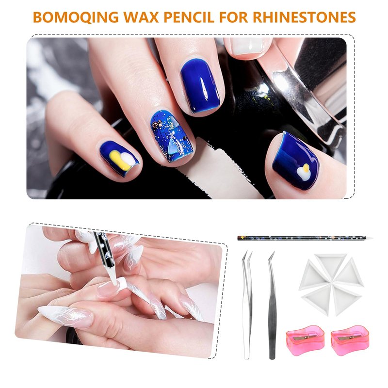 BOMOQING 10 Pencil for Rhinestones Pick up,Wax Rhinestone Picker Tool Pencil Nail Dotting Applicator White Bead Sorting Tray Triangular Plate 1 Pencil Sharpener, 1 Tweezers for Nail Art DIY