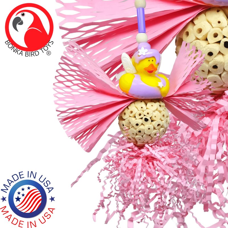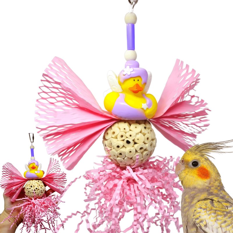 Bonka Bird Toys 1014 Sola Fairy - 8" H x 4" W, Rubber Duck and Sola Ball Toy with Pink Paper Tendrils, Parrot, Conure, Cockatiel, and Similar Size Breeds.