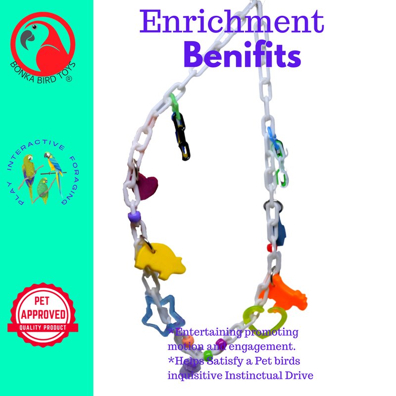 The 1536 Charm Necklace is a beautiful toy to excite your small pet bird. 1536 has a sturdy quick link attachment, making it easy to install in any cage, aviary, or bird setup. The main necklace of 1536 is a bird-safe white plastic link chain with many other items connected. When looking from the quick link attachment down the necklace, you'll find a colored plastic ring with three smaller chains hanging from it. The next item on the necklace is a small plastic bead and another plastic ring with a fun person-shaped colored plastic toy attached to it. Next is a metal ring with a wooden colored heart hanging from it, and another metal ring with a small colored charm hanging. After this are three more colored plastic beads; in the middle of the necklace is a clear plastic pacifier. On the other side of the chain, you'll find the same set of assorted items making the 1536 Charm Necklace packed with fun and excitement! As the chain is light and approximately 26 inches long, any pulling or interaction with the toy will cause lots of movement and give your bird tons of fun. As with all toys from Bonka Bird Toys, 1536 is made with 100% bird-safe materials.