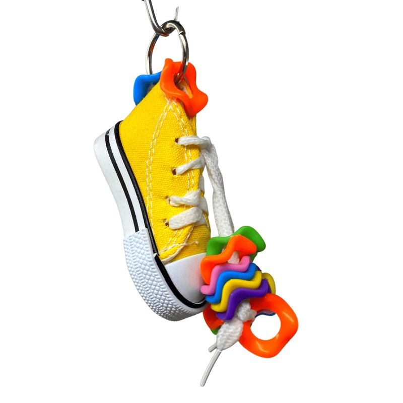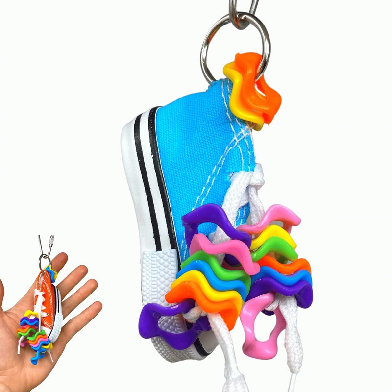 1928 Wiggle sneaker bird toy, not to wear......but to play with, your small feathered companion will spend hours foraging for the treats you have hidden within. A colorful foot toy sneaker is adorned with colorful plastic wavy discs, giving your little friend multiple play options. It measures approximately 3 inches high by 3 inches wide, comes with a quick link for easy cage placement. Color may vary to the one shown.