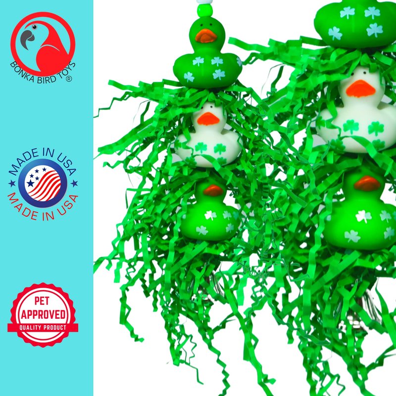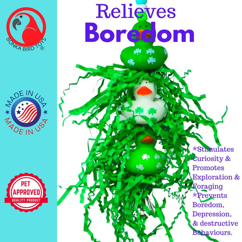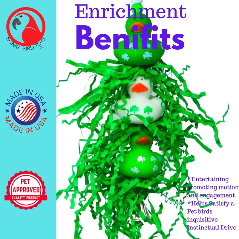 Embark on a delightful adventure with the 2422 Lucky Ducky from Bonka Bird Toys, a beautifully designed toy that promises endless entertainment for your feathered friends. Specifically crafted for small to medium-sized birds, this toy encourages essential behaviors such as chewing and preening, promoting both physical and mental health. The Lucky Ducky features an engaging array of elements, including five vibrant plastic beads that cascade down to three adorable rubber ducks, each decorated with four-leaf clovers, and interspersed with enticing green shreddy paper. This mixture of colors and textures is not only visually appealing but also invites your bird to explore and engage in a variety of activities designed for climbing, plucking, and preening. Setting up the Lucky Ducky is fast and effortless, thanks to the equipped quick-link connector, ensuring that fun is always just a moment away. Ideal for birds like Ringnecks, Medium Conures, Quakers, Caiques, and pets of a similar size, it is made in the USA with 100% bird-safe materials, offering you peace of mind and your bird a secure and stimulating playtime. With its bright, attractive colors, safe, engaging design, and convenient measurements of 9 inches in height and 2 inches in width, the 2422 Lucky Ducky is more than just a toy; it's a comprehensive playground that enriches your bird's life with joy, activity, and growth.