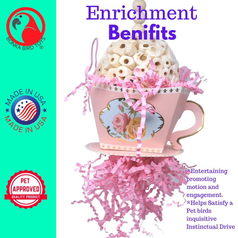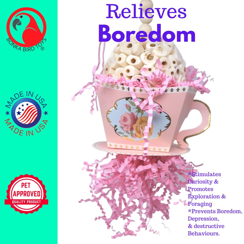 Introducing the Bonka Bird Toys Sola Teacup - a fanciful addition to your aviary that your small to medium-sized birds will absolutely love. The Sola Teacup features a natural Sola Atta ball, elegantly adorned with a decorative, colored cardboard tea cup, vibrant wooden beads, and matching colored crinkly shredding paper. This toy is not just a visual treat but also a hub of activity, offering a perfect opportunity for foraging, chewing, and shredding. Its dimensions of approximately 8 inches in height and 4 inches in width make it a suitable fit for birds like Caiques, Conures, Quakers, and Ringnecks. Understanding a bird's instinctual need to chew, this toy is designed to be destructible yet safe, encouraging your feathered friends to engage in this natural behavior. The varied textures and materials of the Sola Teacup provide an enriching experience, aiding in maintaining both the mental and physical well-being of pet birds. The easy-to-attach quick link ensures that placing this toy in your aviary is hassle-free. Trust in the quality and creativity of Bonka Bird Toys to keep your birds entertained, healthy, and happy.