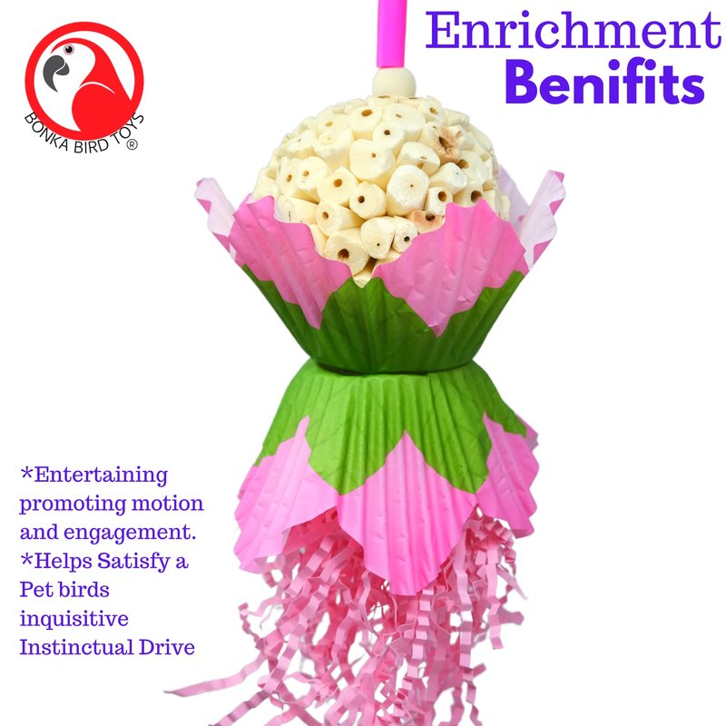 Discover the enchanting world of avian play with the Bonka Bird Toys 2606 Sola Petal Toy. This beautifully crafted toy is an ideal addition to any bird's habitat, offering both aesthetic charm and functional benefits. At its heart is a captivating Natural Sola Ball, surrounded by an array of bright paper petals, creating a visually stimulating experience for your feathered friend. With dimensions of approximately 10 inches in height and 5 inches in width, this toy is perfectly sized for small to medium birds, including Parakeets, Cockatiels, Conures, and more. The 2606 Sola Petal Toy is feather-light, weighing about 1 ounce, allowing birds of various sizes to engage with it effortlessly. This dynamic toy not only adds a splash of color to your bird's environment but also promotes physical activity and mental alertness. Constructed with natural materials, it offers a safe and satisfying chewing experience, crucial for your bird's well-being. By introducing this toy to your aviary, you're providing more than just a plaything; you're enriching your bird's life with an opportunity to explore and enjoy the natural joys of foraging and play.