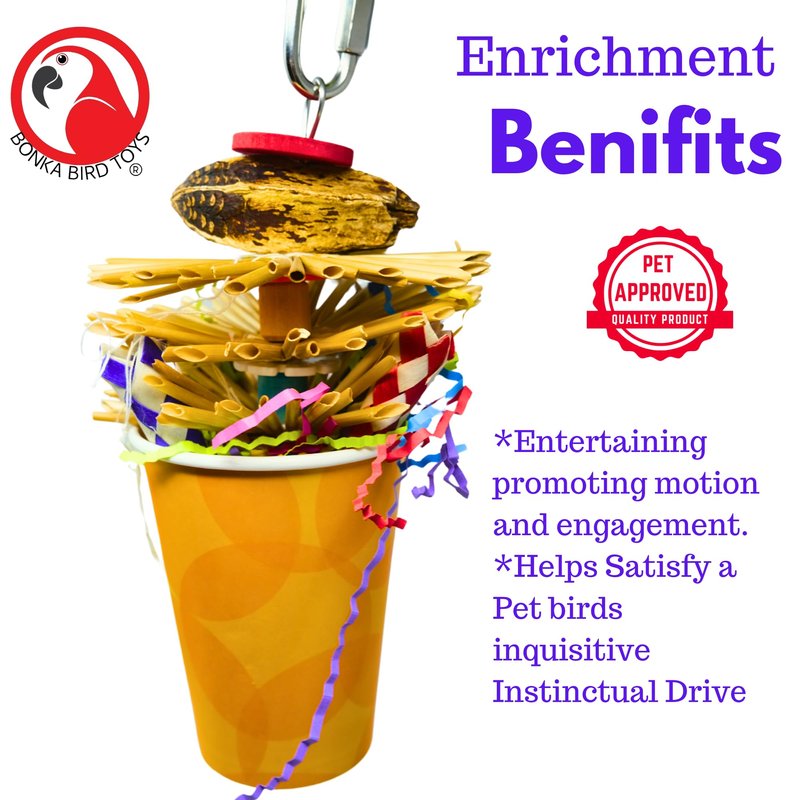 Introducing the 2641 Party Cup from Bonka Bird Toys - a dynamic and interactive toy designed to delight and entertain your bird. Crafted with a variety of materials including bamboo, mahogany, and vibrant paper streamers, this toy encourages your bird to engage in natural foraging behaviors and provides essential mental and physical stimulation. Each element of the Party Cup is carefully selected to promote health and dexterity through natural play activities.