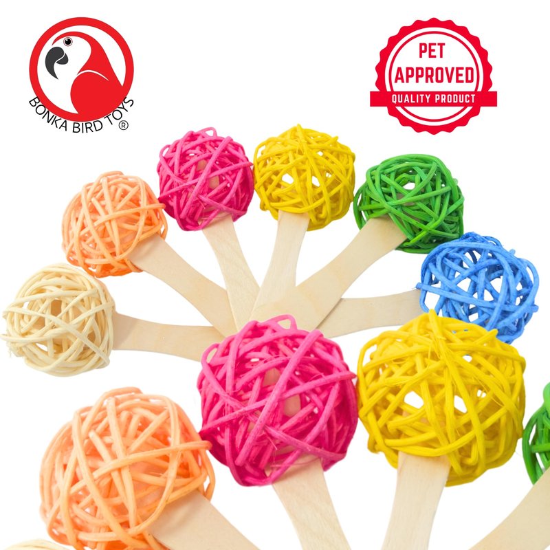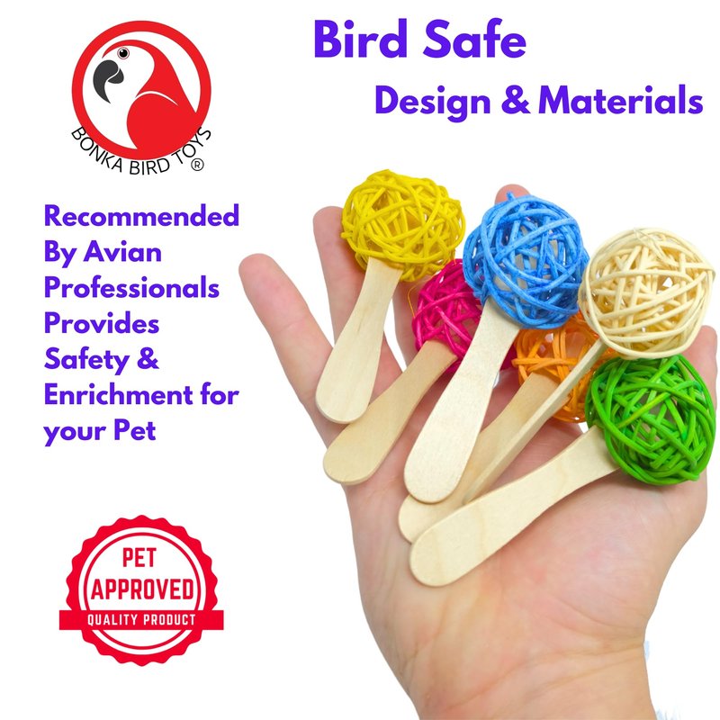 Introducing the Bonka Bird Toys 2642 Pk6 Vine Lollipop—a delightful and playful addition to your bird's toy collection. These unique lollipop foot toys, measuring 4 inches in length with a 2-inch diameter, are perfectly sized and lightweight at 2 ounces each, making them easy for birds to manipulate and enjoy. Crafted from natural wicker balls attached to sturdy wooden popsicle sticks, these toys are designed for safe and durable playtime. The vibrant colors of the Vine Lollipops captivate and stimulate your bird's visual senses, while the natural textures encourage instinctual pecking and provide excellent opportunities for beak conditioning. These toys promote both foot and beak exercise, enhancing your bird's dexterity as they learn to hold, toss, and peck at the lollipops. Additionally, the Vine Lollipops offer mental stimulation, keeping your bird engaged and helping to prevent boredom and associated behavioral issues. Perfect for birds of all sizes, especially those that enjoy foot toys, the 2642 Pk6 Vine Lollipop is ideal for bird owners looking for toys that provide both physical and mental challenges. Packaged in a set of six, these lollipop toys are an excellent way to keep your bird entertained and active throughout the day, whether used in their cage or during supervised playtime.