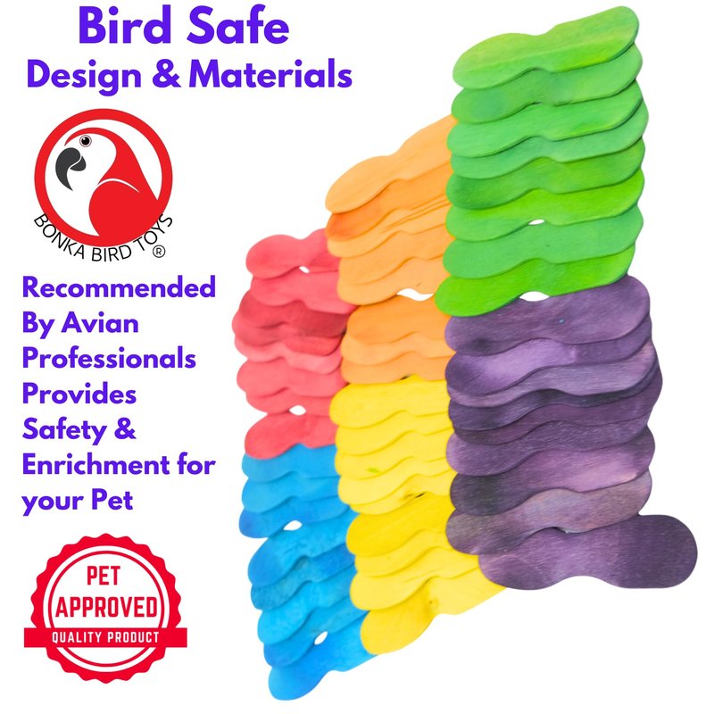 Introducing the Bonka Bird Toys 2665 PK50 Mini Scoop Spoon—a vibrant and versatile pack of 50 wooden tongue depressors, perfect for adding a splash of color and creativity to your bird’s toy collection. Each spoon measures approximately 3 inches long and 1 inch wide, and the entire pack weighs around 2.5 ounces, making it an ideal choice for various play and DIY projects. Crafted from vegetable-dyed wood, these spoons are safe and durable, providing a rainbow of enticing colors to stimulate your bird's visual senses and encourage interaction. The 2665 Mini Scoop Spoon set is perfect for small to medium birds, offering endless possibilities for foot toys and creative building blocks for DIY toy projects. The colorful design of these spoons not only captivates your bird’s attention but also promotes mental stimulation by encouraging creative play and problem-solving. They help enhance physical activity by promoting dexterity and coordination while providing a satisfying chew experience. Bird owners who enjoy crafting personalized toys will find these spoons great for tailoring to their bird’s preferences. Perfect for birds of all sizes, especially those who enjoy foot toys or require gentle beak activities, the 2665 PK50 Mini Scoop Spoon set is a fantastic way to engage your pet in unique and stimulating play. Whether used individually or as part of a larger project, these spoons are sure to provide hours of enjoyment and discovery.